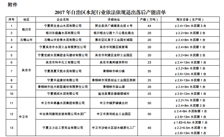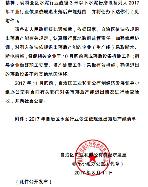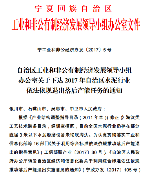 自治區(qū)工業(yè)和非公有制經(jīng)濟(jì)發(fā)展領(lǐng)導(dǎo)小組辦公室關(guān)于下達(dá)2017年自治區(qū)水泥行業(yè)依法依規(guī)退出落后產(chǎn)能任務(wù)的通知 |